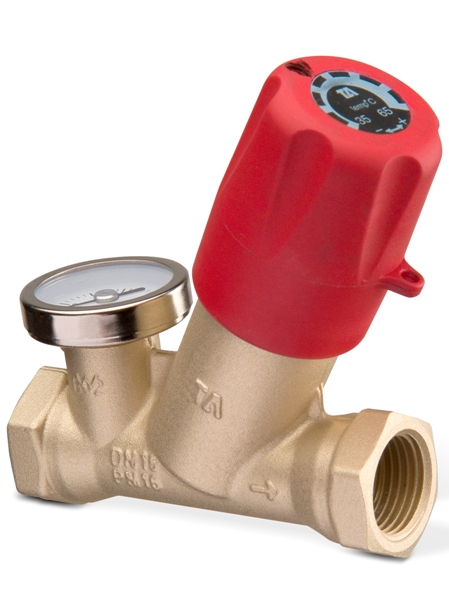 Zawór termostatyczny. Ciągła nastawa temperatury. Wbudowany termometr (opcjonalnie). Wewnętrzne części wykonane z acetal. O-ringi wykonane z EPDM.
