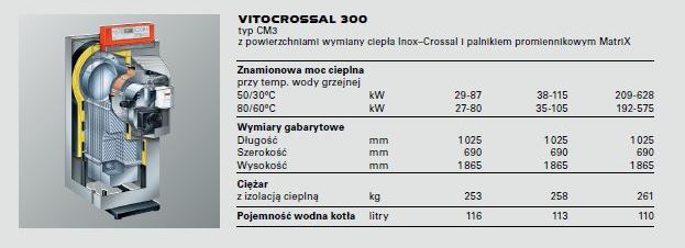 Wysokoefektywny kocioł kondensacyjny, intensywnie wykorzystujący ciepło spalin. Urządzenie łączy w sobie dwa najwyższej klasy rozwiązania techniczne firmy Viessmann: powierzchnię grzewczą Inox-Crossal i palnik promiennikowy MatriX. Zastosowanie kotła Vitocrossal 300 redukuje koszty ogrzewania oraz minimalizuje emisję zanieczyszczeń.