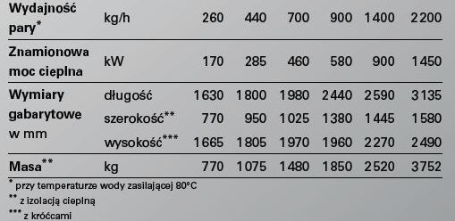 Wydajność pary: 260 do 220 kg/h - 170 do 1450 kW